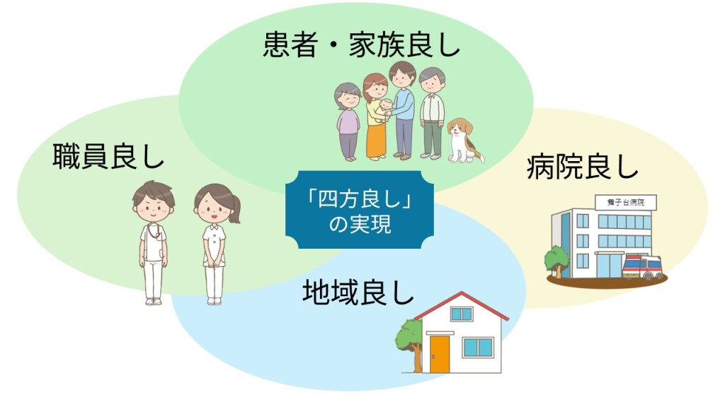 ミッション「地域医療への貢献」、ビジョン「地域住民から信頼され選ばれる質の高い看護の提供」を達成させるためには、「患者様、ご家族様の健康と幸せ」、「地域医療への貢献」、「当院で働く職員のやりがいと成長」、「地域医療を守るための病院の発展」、この四方向の実現が必要と考えています。